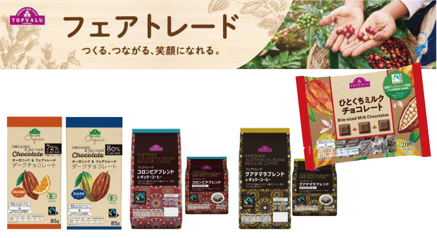 イオン:2002年にイオン21キャンペーンで、お客さまから寄せられた「日常生活を国際貢献と結びつけるパイプ役になって欲しい」という声を受けて、2004年にフェアトレードコーヒーを発売するに至りました。2014年には、当時、アジアで初めて、フェアトレード調達プログラムに参加し、2012年比で、2020年にフェアトレード認証カカオの調達量を10倍にするという目標を掲げて取り組んできました。2016年には、オーガニックとフェアトレードのW認証のジャムを発売するなど、長年の取り組みを続けて、様々な商品の品ぞろえの拡充に取り組んでいます。